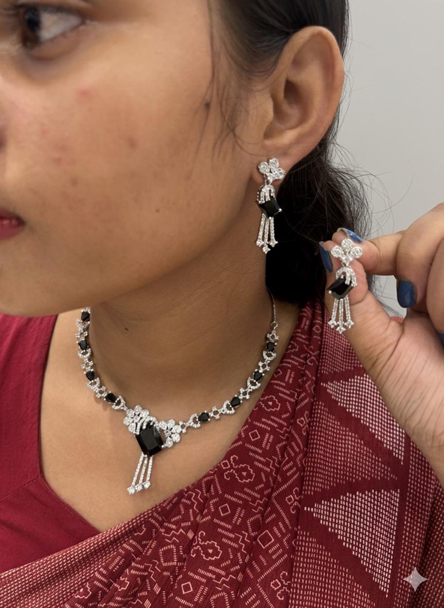 Dazzle in elegance with this exquisite necklace set, crafted with shimmering American diamonds and a teardrop-shaped black gemstone centerpiece. The matching earrings complete the luxurious look, making it perfect for weddings, parties, and special occasions. A timeless piece that blends sophistication with sparkle."