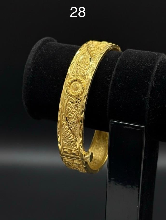 This beautifully crafted Chur-style bangle is plated with premium 24K gold and designed with intricate patterns that highlight traditional artistry. Its bold and elegant look makes it an ideal choice for weddings, festivals, and cultural occasions. Comes with a 6-month colour guarantee for long-lasting shine and durability.