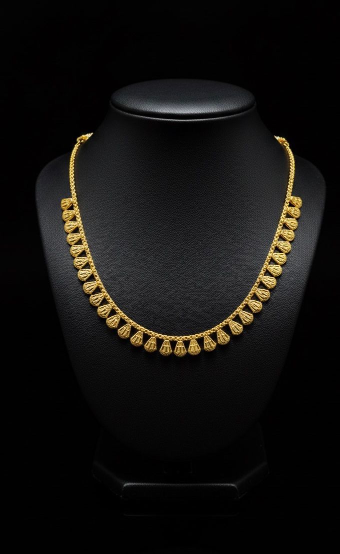 Add a touch of timeless elegance to your ethnic wardrobe with this beautifully crafted 24K gold-plated necklace. Designed with a delicate pattern of teardrop-shaped motifs along the chain, the centerpiece features a stunning floral pendant finished with a subtle drop charm, enhancing its traditional allure.