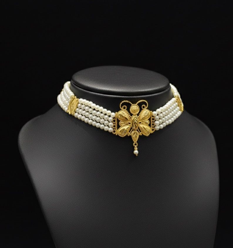 Make a bold yet traditional statement with our Pola Chik, beautifully crafted with intricate detailing and adorned with a heart-shaped centerpiece. Featuring multiple rows of glossy pearls and accented with vibrant red and gold tones, this choker is ideal for festive and cultural occasions.