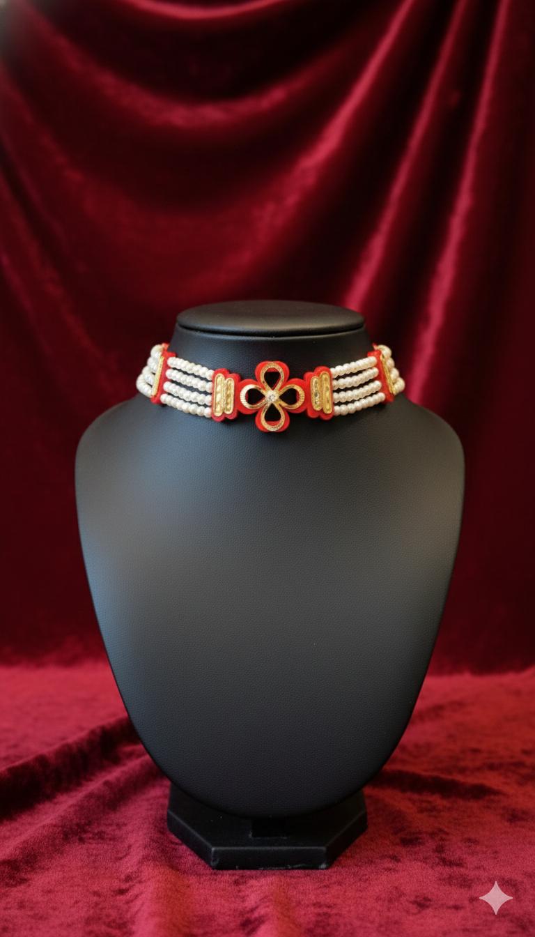 Make a bold yet traditional statement with our Pola Chik, beautifully crafted with intricate detailing and adorned with a heart-shaped centerpiece. Featuring multiple rows of glossy pearls and accented with vibrant red and gold tones, this choker is ideal for festive and cultural occasions.