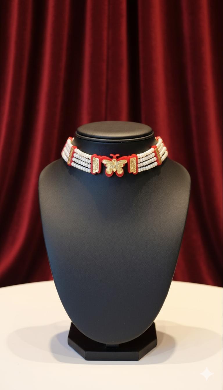 Make a bold yet traditional statement with our Pola Chik, beautifully crafted with intricate detailing and adorned with a heart-shaped centerpiece. Featuring multiple rows of glossy pearls and accented with vibrant red and gold tones, this choker is ideal for festive and cultural occasions.