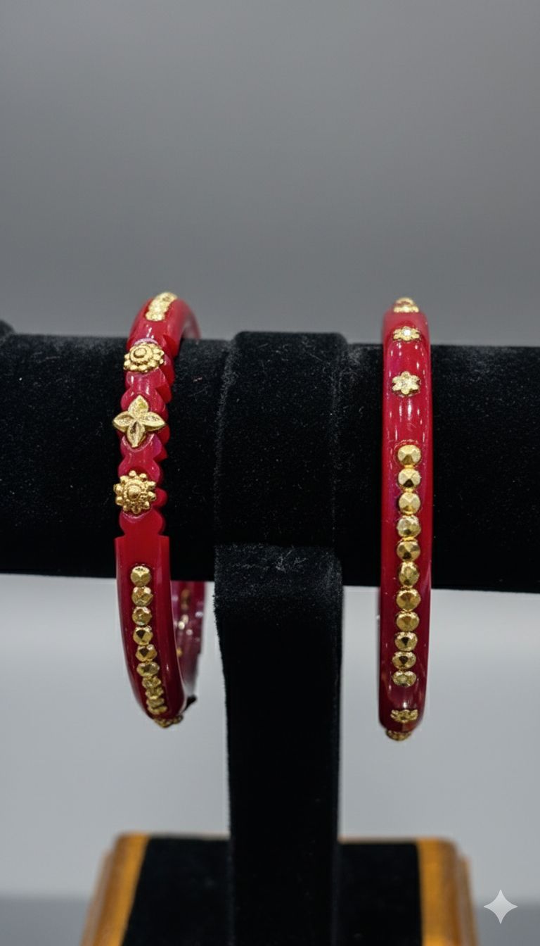 Celebrate tradition with elegance through these vibrant red Pola bangles, accented with finely engraved 24K gold-plated panels. A perfect choice for festive occasions, weddings, and rituals, these bangles reflect timeless Bengali heritage with a modern touch.