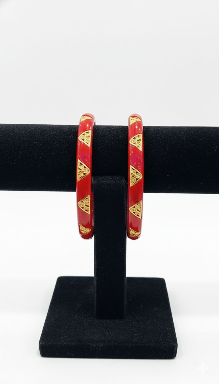 Celebrate tradition with elegance through these vibrant red Pola bangles, accented with finely engraved 24K gold-plated panels. A perfect choice for festive occasions, weddings, and rituals, these bangles reflect timeless Bengali heritage with a modern touch.