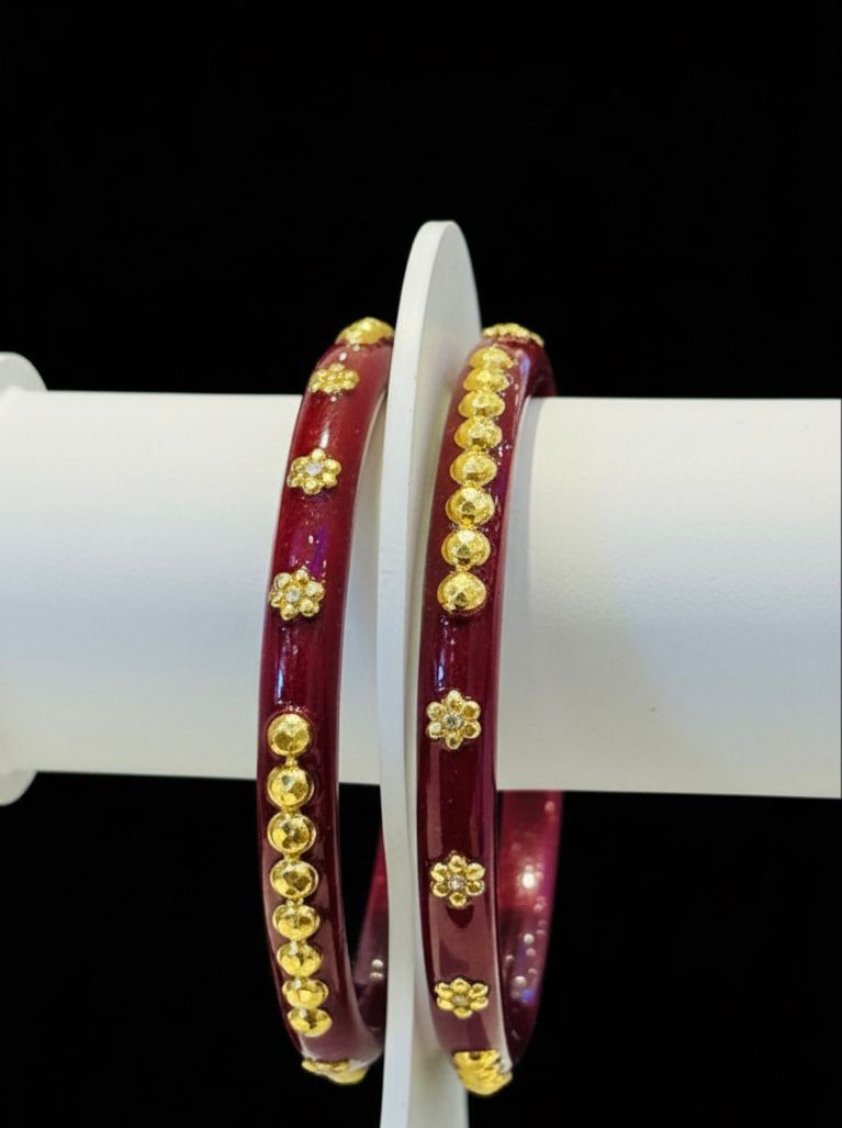 Beautifully crafted traditional Pola bangles, plated with premium 24K gold for a rich and elegant shine. These bangles are designed with a smooth red finish and delicate golden detailing, making them perfect for cultural occasions, festivals, and daily wear. Comes with a 6-month colour guarantee, ensuring lasting shine and durability.