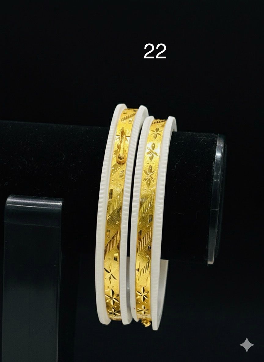 A perfect blend of tradition and style, this Elegant Design Sakha features a unique wavy gold pattern over a pure white base. The fine detailing and 24K gold plating give it a premium and luxurious appeal, making it ideal for both everyday ethnic wear and festive occasions.