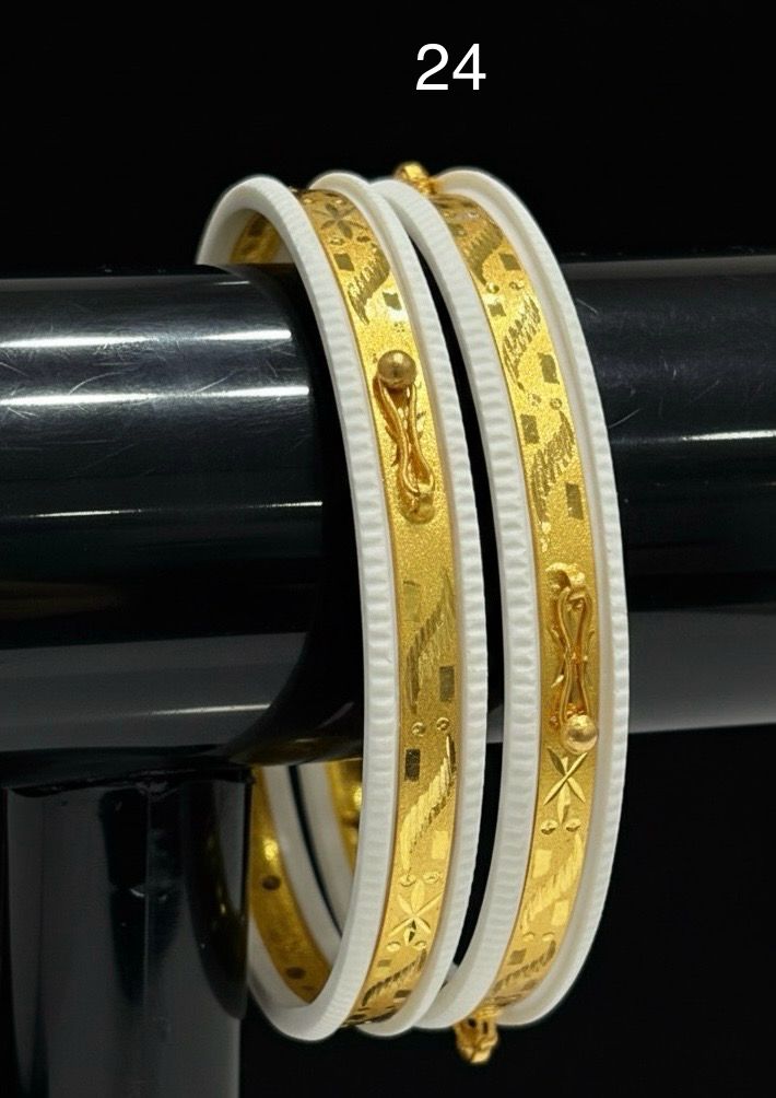 A perfect blend of tradition and style, this Elegant Design Sakha features a unique wavy gold pattern over a pure white base. The fine detailing and 24K gold plating give it a premium and luxurious appeal, making it ideal for both everyday ethnic wear and festive occasions.