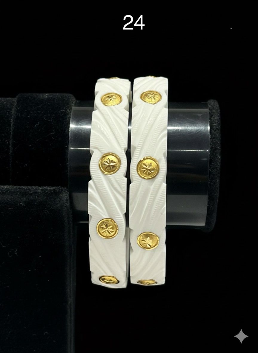 A perfect blend of tradition and style, this Elegant Design Sakha features a unique wavy gold pattern over a pure white base. The fine detailing and 24K gold plating give it a premium and luxurious appeal, making it ideal for both everyday ethnic wear and festive occasions.