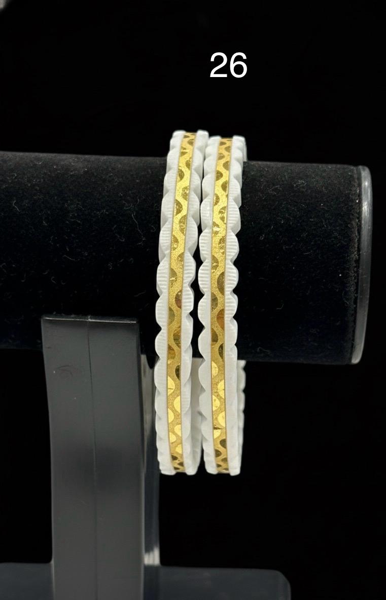A perfect blend of tradition and style, this Elegant Design Sakha features a unique wavy gold pattern over a pure white base. The fine detailing and 24K gold plating give it a premium and luxurious appeal, making it ideal for both everyday ethnic wear and festive occasions.